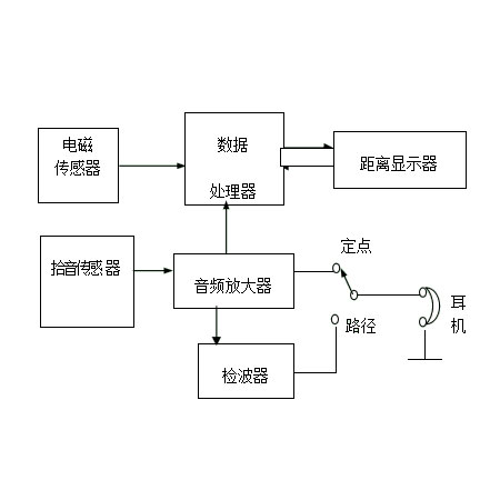 3、音频放大器可放大拾音传感器拾取的微弱地震波信号,由耳机监听其大小,配合显示屏数据精确定点。如果地震波太弱,形不成计数中断信号,距离显示器将自动发出中断信号使其满亮显示99.9米。